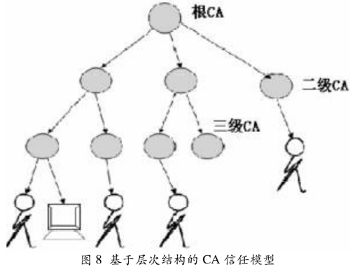 根CA具有一個(gè)自簽名的證書(shū),根CA依次對(duì)它下面的CA進(jìn)行簽名,層次結(jié)構(gòu)中葉子節(jié)點(diǎn)上的CA用于對(duì)安全個(gè)體進(jìn)行簽名。對(duì)于個(gè)體而言,它需要信任根CA,中間的CA可以不必關(guān)心(透明的);同時(shí)它的證書(shū)是由底層的CA簽發(fā)的,沿著層次樹(shù)往上找,可以構(gòu)成一條證書(shū)鏈,直到根證書(shū)??v向加密裝置CA系統(tǒng)的部署拓?fù)鋱D如圖9所示。