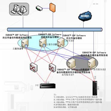 主服務(wù)器1安裝EUBASETM CDP Software的數(shù)據(jù)同步模塊和文件備份模塊主服務(wù)端,主服務(wù)器2安裝EUBASETM CDP Software的數(shù)據(jù)備份模塊的主服務(wù)端,主服務(wù)器3安裝EUBASETM CDP Software的文件備份模塊,備用服務(wù)器1安裝EUBASETM CDP Software的數(shù)據(jù)同步模塊和數(shù)據(jù)備份模塊的備用服務(wù)端,備用服務(wù)器2安裝EUBASETM CDP Software的文件備份模塊的備用服務(wù)端。主服務(wù)器上的數(shù)據(jù)將同步到備用服務(wù)器1,文件備份到備用服務(wù)器2,主服務(wù)器2將數(shù)據(jù)備份到1,保證數(shù)據(jù)的安全性,主服務(wù)器3的文件備份到備用服務(wù)器2,保證文件的安全性。