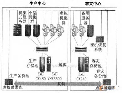 (1)關(guān)鍵業(yè)務(wù)系統(tǒng)運(yùn)行平臺(tái)為小型機(jī)集群和虛擬機(jī)集群,通過光纖交換機(jī)連接至后臺(tái)的EMCCX480存儲(chǔ)和VNX5500存儲(chǔ),同時(shí)在容災(zāi)中心也有一套存儲(chǔ)設(shè)備與之構(gòu)成鏡像復(fù)制的關(guān)系,采用的策略為同步復(fù)制策略。同時(shí)配備備用服務(wù)器,構(gòu)成完整的應(yīng)用級(jí)容災(zāi)的基礎(chǔ)環(huán)境。