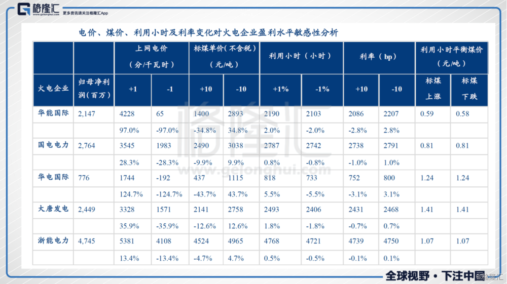 華創(chuàng)證券對(duì)幾大火電企業(yè)作了敏感性分析。分析表明,對(duì)火電企業(yè)盈利影響最大的是上網(wǎng)電價(jià),其次是煤價(jià),最后是利用小時(shí)數(shù)。由于用量需求量上漲,利用小時(shí)數(shù)才會(huì)上漲,而煤價(jià)也會(huì)因需求上升而漲,所以利用小時(shí)數(shù)與煤價(jià)有負(fù)相關(guān)關(guān)系。利用小時(shí)平衡煤價(jià)表明煤價(jià)漲幅多少可以抵消利用小數(shù)每漲1%時(shí)帶來(lái)的利潤(rùn)。