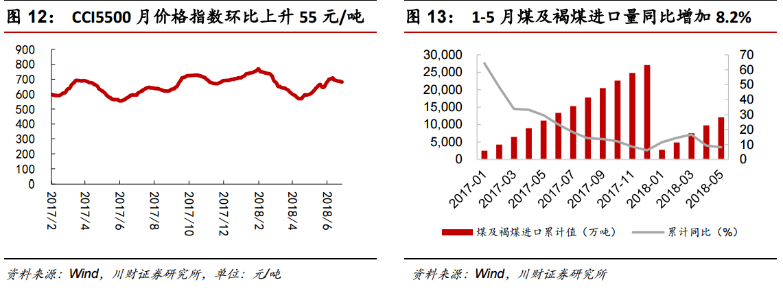煤炭方面:截至 2018 年 6 月 29 日,CCI5500(含稅)動(dòng)力煤價(jià)格指數(shù)為 681 元/噸,月平均價(jià)格指數(shù)為 692.05 元/噸,環(huán)比上升 55.1 元/噸;截止 5 月我國(guó)煤及褐煤進(jìn)口量 12073 萬噸,同比增長(zhǎng) 8.2%。