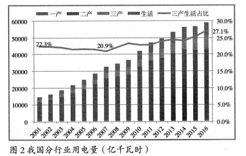 2008年金融危機之后,我國二產用電量增長放緩,波動很大,但三產和生活用電保持穩(wěn)定增長。其中,2015午二產用電負增長;2016年用電增量2265億千瓦時,二產、三產、居民生活用電增量分別為666億千瓦時、795億千瓦時、769億千瓦時,三分天下。