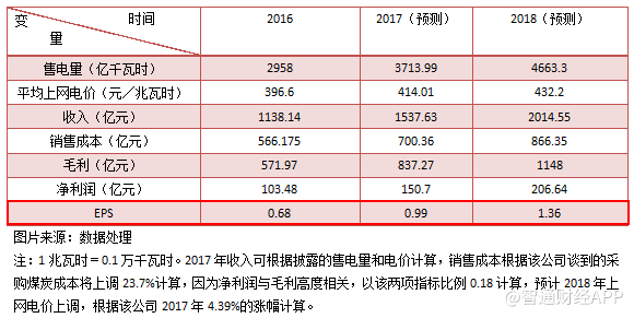 回歸到華能國際電力的估值,下面我們將通過上文數(shù)據(jù)預(yù)測該公司2017年的業(yè)績情況,因為各業(yè)績變量存在一定的相關(guān)關(guān)系,比如收入與售電量高度相關(guān),銷售成本于煤炭等燃料成本高度相關(guān),近利潤又與毛利率高度相關(guān),因此根據(jù)相關(guān)關(guān)系,可以對該公司業(yè)績進(jìn)行預(yù)測,從而進(jìn)行EPS估值。