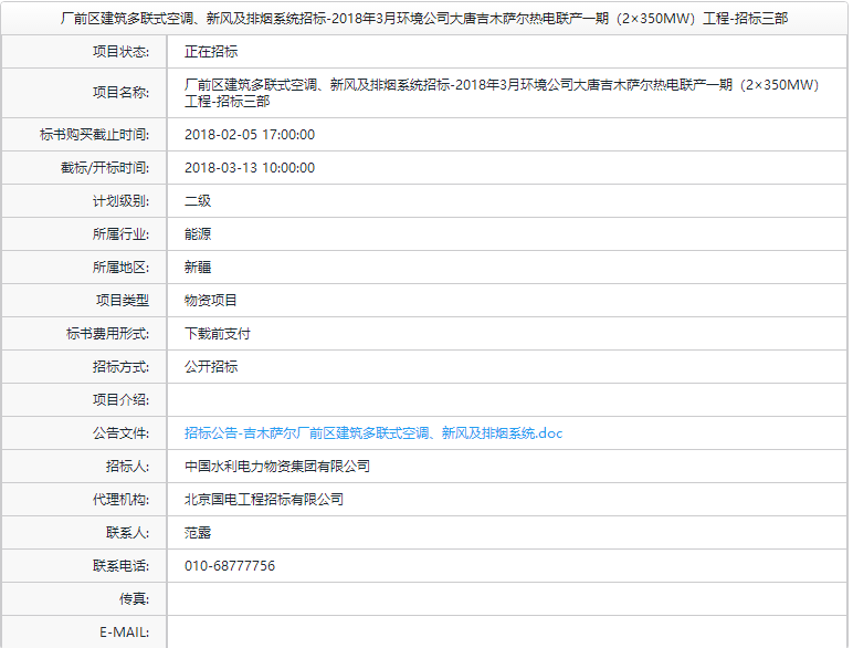廠前區(qū)建筑多聯(lián)式空調(diào)、新風及排煙系統(tǒng)招標-2018年3月環(huán)境公司大唐吉木薩爾熱電聯(lián)產(chǎn)一期(2×350MW)工程-招標三部