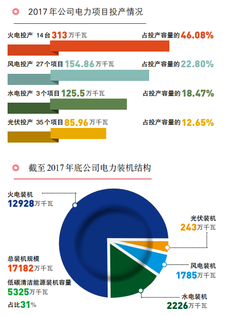 截至2017年底,公司總裝機達到17182萬千瓦,其中低碳清潔能源裝機達到5325萬千瓦,占比31%,比2016年底提高2個百分點。