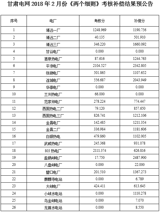 2018年2月甘肅電網(wǎng)“兩個(gè)細(xì)則”考核工作已經(jīng)完成,現(xiàn)對(duì)各電廠考核補(bǔ)償分?jǐn)?shù)(不含分?jǐn)?結(jié)果進(jìn)行預(yù)公告,請(qǐng)各發(fā)電廠認(rèn)真核對(duì)考核、補(bǔ)償結(jié)果,如有疑問(wèn),請(qǐng)于4月3日前與甘肅能源監(jiān)管辦或甘肅省電力公司溝通聯(lián)系。