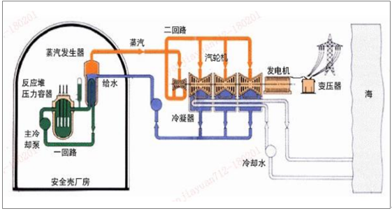 核電是利用核反應(yīng)堆中核裂變所釋放出的熱能進(jìn)行發(fā)電的電能生產(chǎn)方式。在核裂變過程中,快中子經(jīng)慢化后變?yōu)槁凶?,撞擊原子核,發(fā)生受控的鏈?zhǔn)椒磻?yīng),產(chǎn)生熱能,生成蒸汽,從而推動(dòng)汽輪機(jī)運(yùn)轉(zhuǎn)。核電站與我們常見的燃煤、燃?xì)獾?a href="http://m.jmzyw.com/eduinfo/hd/" target="_blank" class="keylink">火電站一樣,均通過使用燃料生成的高溫蒸汽推動(dòng)汽輪機(jī)旋轉(zhuǎn),帶動(dòng)發(fā)電機(jī)進(jìn)行發(fā)電。兩者的不同之處主要在于蒸汽供應(yīng)系統(tǒng),火電廠依靠燃燒化石燃料(煤、石油或者天然氣)釋放的化學(xué)能將水變成蒸汽,核電站則依靠核燃料的核裂變反應(yīng)釋放的輻射能將水變成蒸汽。除反應(yīng)堆外,核電站兵他系統(tǒng)的發(fā)電原理與常規(guī)火電站類似。