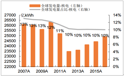 全球核電發(fā)電量在總發(fā)電量中的占比變化