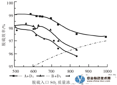 整體脫硫效率A+D>B+D>C+D,在SO2濃度小于700mg/m3時,3種運行方式的脫硫效率均能滿足排放要求。