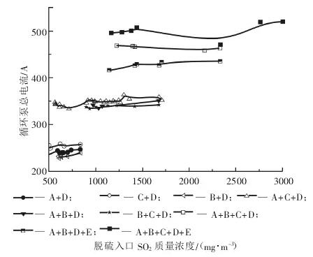 由式(2)可知,電流I為實際運行值。因此,可以用循環(huán)泵運行電流I作為分析能耗的指標。圖4為漿液循環(huán)泵不同組合方式運行下的總電流值。雙泵A+D運行總電流在250A左右,而5臺泵A+B+C+D+E全部開啟時運行總電流可達到500A左右,是A+D的兩倍。在脫硫效果能滿足排放要求的前提下,投入運行的循環(huán)泵數(shù)量越少,能耗電量越低。