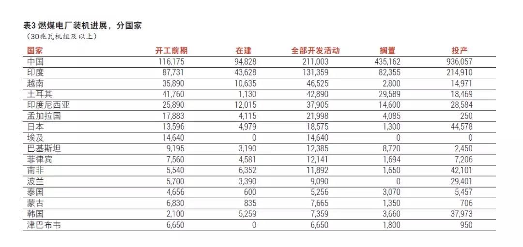 如表3所示,燃煤電廠仍然在60個國家內(nèi)積極擴張。在這60個國家之中,15個國家的燃煤電廠項目占據(jù)了90%的新增裝機容量。本報告接下來將對這些熱點國家進行逐一分析,并對美國和歐盟進行簡要闡述。