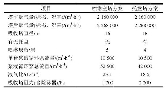 雖然相對(duì)于噴淋空塔方案,托盤塔方案吸收塔阻力增加500Pa,引起風(fēng)機(jī)電耗增加510kW,但噴淋空塔方案多設(shè)置1層噴淋層,其對(duì)應(yīng)的循環(huán)泵軸功率為1097kW,兩者疊加得出在設(shè)計(jì)工況下運(yùn)行時(shí)托盤塔方案可節(jié)能587kW,減少廠用電率約0.1%。