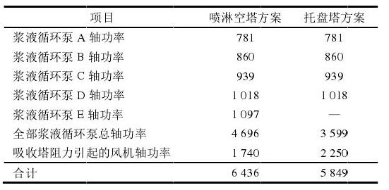 吸收塔系統(tǒng)的主要電耗為漿液循環(huán)泵電耗及吸收塔阻力引起的引風(fēng)機(jī)(或增壓風(fēng)機(jī))電耗,包括漿液循環(huán)泵軸功率和吸收塔阻力導(dǎo)致的風(fēng)機(jī)軸功率。噴淋空塔方案和托盤塔方案的吸收塔電耗對(duì)比見表2。