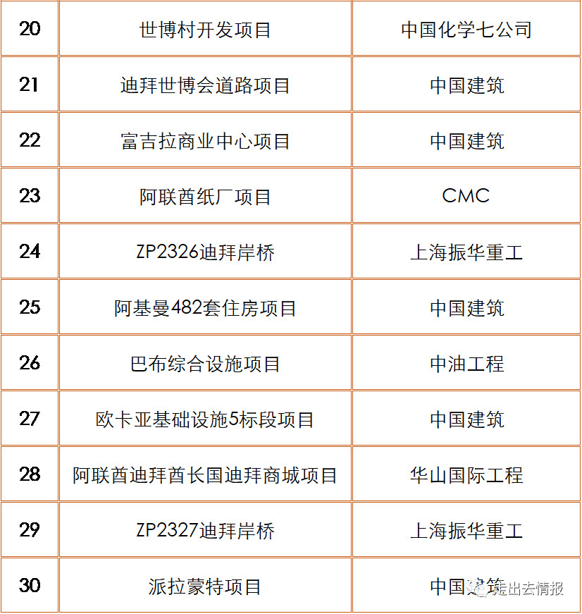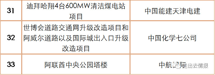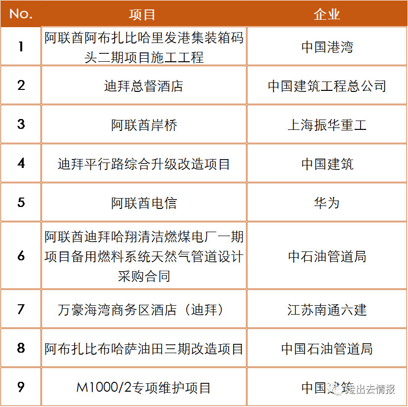 據(jù)《走出去情報(bào)》統(tǒng)計(jì),2017年中國企業(yè)在阿聯(lián)酋新簽500萬美元以上工程承包項(xiàng)目近50個(gè),其中重點(diǎn)項(xiàng)目包括: