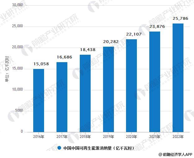 據(jù)前瞻產(chǎn)業(yè)研究院數(shù)據(jù)顯示,2016年我國(guó)可再生能源電力消納量為15058億千瓦時(shí)。2017年,包含水電在內(nèi),全部可再生能源電力消納量為16686億千瓦時(shí),同比增加10.8%,占全社會(huì)用電量的比重為26.5%,同比上升1.1個(gè)百分點(diǎn)。預(yù)計(jì)到2018年我國(guó)可再生能源電力消納量將達(dá)到18438億千瓦時(shí),未來(lái)五年(2018-2022)年均復(fù)合增長(zhǎng)率約為8.75%,2022年將達(dá)到25786億千瓦時(shí)。