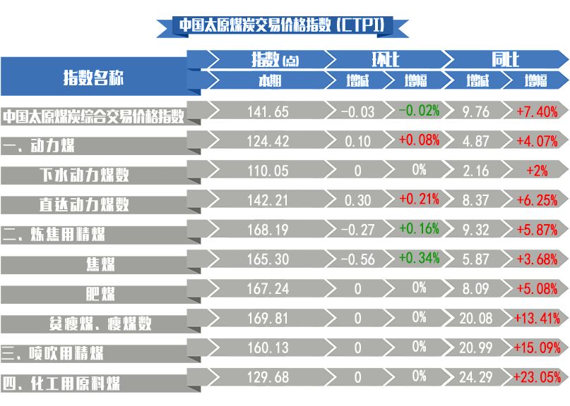 截至2018年7月16日,第258期中國太原煤炭綜合交易價格指數(shù)為141.65點,環(huán)比下跌0.02%。其中:動力煤指數(shù)124.42點,環(huán)比上漲0.08%;煉焦用精煤指數(shù)168.19點,環(huán)比下跌0.16%;噴吹用精煤指數(shù)160.13點,環(huán)比持平;化工用原料煤指數(shù)129.68點,環(huán)比持平。