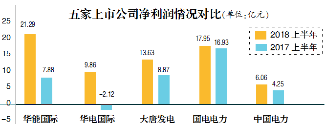 2017年上半年,華電國(guó)際凈虧損2.12億元,其余四家凈利潤(rùn)額也大幅下降;而今年上半年,由于煤電經(jīng)營(yíng)壓力相對(duì)減小,各公司凈利潤(rùn)均較上年同期有明顯改善。華能國(guó)際上半年凈利潤(rùn)錄得21.29億元,較上年同期大幅增長(zhǎng)約170%,規(guī)模優(yōu)勢(shì)得以體現(xiàn);華電國(guó)際也順利扭虧為盈,凈利潤(rùn)為9.86億元。