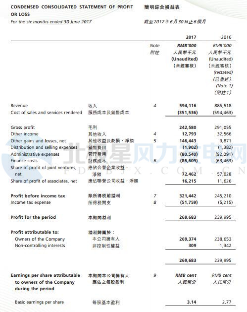 本報告期內(nèi), 集團實現(xiàn)收入人民幣594,116,000元(2016年同期: 人 民幣885,518,000元),較去年同期下降 32.91%;集團權(quán)益持有人應(yīng)佔溢利人民 幣269,374,000元(2016年同期:人民幣238,653,000元),較去年同期增長 12.87%;每股基本盈利為人民幣3.14 分(2016年同期:人民幣2.77分),較去年同期增長13.36%;每股全面攤薄盈利為人民幣3.13分(2016年同期:人民幣2.76分)。截至本報告期末,集團資產(chǎn)淨值人民幣 5,312,611,000元(2016年12月31日:人民幣5,225,750,000元)。截至本報告期末,集團持有的現(xiàn)金及現(xiàn)金等值項目人民幣1,817,313,000元(2016年12月 31日:人民幣1,891,277,000元)。