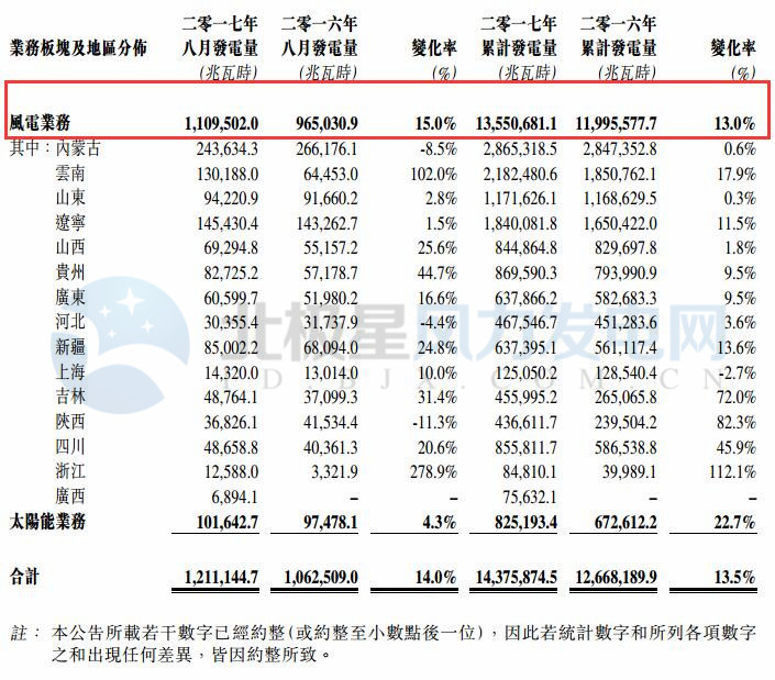 截至2017年8月31日止,華能新能源累計(jì)完成總發(fā)電量143.76億千瓦時(shí)(14,375,874.5兆瓦時(shí)),同比增長(zhǎng)13.5%。其中,風(fēng)電發(fā)電量為135.51億千瓦時(shí)(13,550,681.1兆瓦時(shí)),同比增長(zhǎng)13.0%。