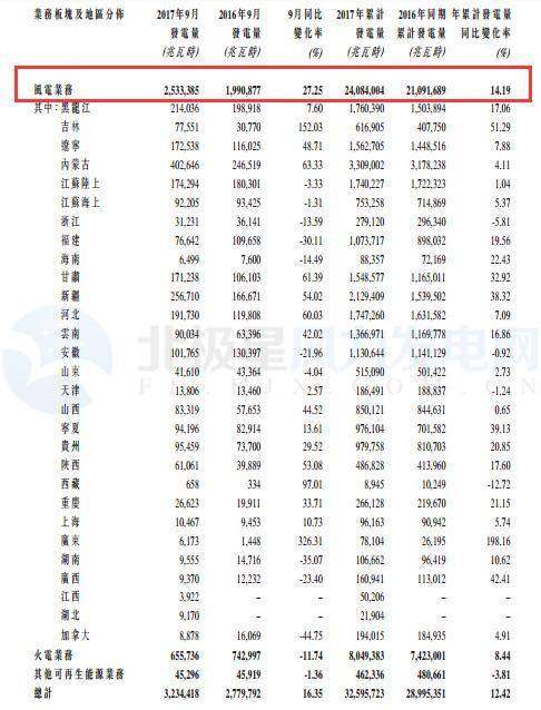 龍?jiān)措娏?017年8月完成發(fā)電量32 34億千瓦時(shí)(3,234,418兆瓦時(shí)),同比增加16 35%。其中,風(fēng)電發(fā)電量25 33億千瓦時(shí)(2,533,385兆瓦時(shí)),同比增加27 25%,其他可再生能源發(fā)電量減少1 36%。截至2017年9月30日,龍?jiān)?