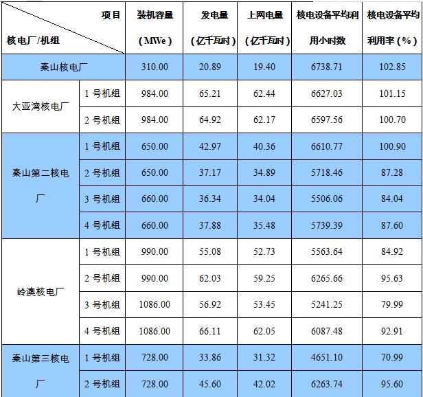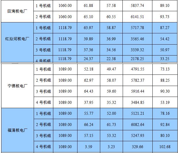 說(shuō)明:紅沿河核電廠2號(hào)機(jī)組1月初處于第2次換料大修期間,1月上旬至2月中旬應(yīng)電網(wǎng)要求臨停備用,3月中旬至4月下旬應(yīng)電網(wǎng)要求停機(jī),5月初至6月初應(yīng)電網(wǎng)要求停機(jī),6月中下旬至7月底應(yīng)電網(wǎng)要求降功率運(yùn)行;3號(hào)機(jī)組1月至2月上旬處于臨停檢修狀態(tài),2月上旬至4月中旬進(jìn)行了第1次換料大修,4月下旬至5月初應(yīng)電網(wǎng)要求進(jìn)入季節(jié)性停運(yùn)狀態(tài),6月中下旬至8月初應(yīng)電網(wǎng)要求降功率運(yùn)行;4號(hào)機(jī)組1月下旬至3月中旬應(yīng)電網(wǎng)要求臨停檢修,4月初至4月中旬應(yīng)電網(wǎng)要求降功率運(yùn)行,4月下旬至6月中旬進(jìn)行了專項(xiàng)檢修,6月下旬至7月底應(yīng)電網(wǎng)要求降功率運(yùn)行,隨后進(jìn)行季節(jié)性停運(yùn),截至9月底仍處于停運(yùn)狀態(tài)。寧德核電廠4號(hào)機(jī)組1月下旬至2月上旬應(yīng)電網(wǎng)要求調(diào)停,2月下旬至3月中旬應(yīng)電網(wǎng)要求降功率運(yùn)行,4月上旬應(yīng)電網(wǎng)要求停機(jī)備用,4月中旬應(yīng)電網(wǎng)要求降功率運(yùn)行,4月底至5月中旬應(yīng)電網(wǎng)要求降功率運(yùn)行,隨后因電網(wǎng)線路改造停機(jī)至6月底,8月下旬開(kāi)始進(jìn)行第1次換料大修,截至9月底,大修仍在進(jìn)行。昌江核電廠1號(hào)機(jī)組1月中旬至3月下旬進(jìn)行了第1次換料大修,4月至9月大部分時(shí)間應(yīng)電網(wǎng)要求降功率運(yùn)行。防城港核電廠1號(hào)機(jī)組1月初至3月底進(jìn)行了第1次換料大修,4月底至5月上旬、5月底至6月初、7月初至7月下旬應(yīng)電網(wǎng)要求停機(jī)備用,4月中下旬、5月中下旬、6月下旬至7月初應(yīng)電網(wǎng)要求降功率運(yùn)行,7月下旬至8月中下旬應(yīng)電網(wǎng)要求降功率運(yùn)行,8月中下旬兩次應(yīng)電網(wǎng)要求周末臨停備用。因此,上述機(jī)組在1月至9月的核電設(shè)備平均利用率偏低。