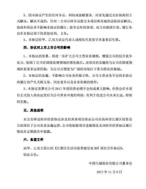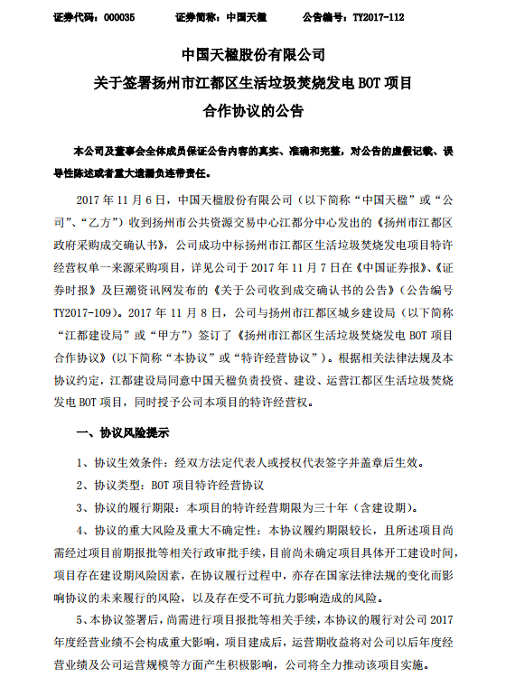 原標(biāo)題:中國(guó)天楹:與江都區(qū)簽訂生活垃圾焚燒發(fā)電BOT協(xié)議