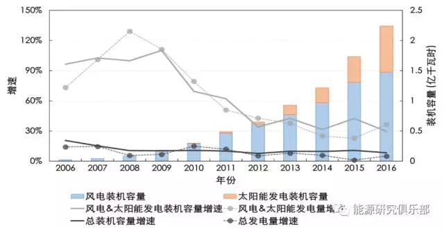 圖2 中國(guó)風(fēng)電、太陽(yáng)能發(fā)電裝機(jī)及發(fā)電量增速情況