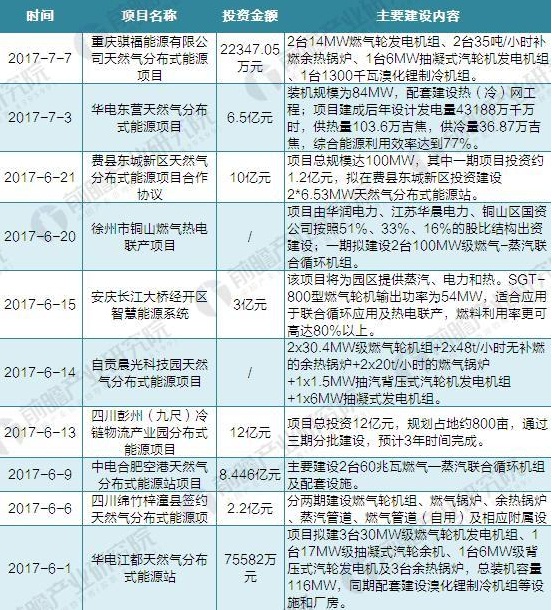 圖表1:截至2017年10月部分天然氣分布式能源項(xiàng)目建設(shè)及簽約情況匯總