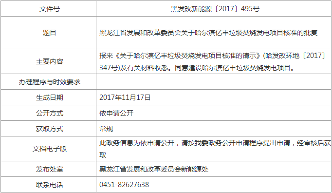 黑龍江省發(fā)展和改革委員會關于哈爾濱億豐垃圾焚燒發(fā)電項目核準的批復