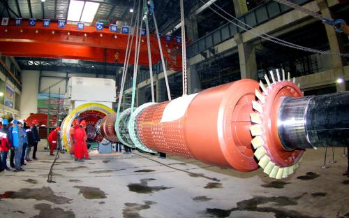 2017年3月9日,寧夏棗泉電廠1號(hào)機(jī)組發(fā)電機(jī)轉(zhuǎn)子穿裝成功。張軍 攝