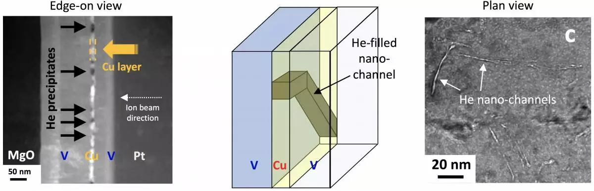 在《科學(xué)進(jìn)展》期刊發(fā)表的一篇報道中,研究人員說明了對氦在納米復(fù)合固體材料中的行為進(jìn)行測試的方法,這些材料使用金屬層壓制而成,研究人員發(fā)現(xiàn),氦氣在這些納米復(fù)合固體材料中不會像在傳統(tǒng)材料中那樣形成氣泡,相反地是形成了長長的、像靜脈那樣的隧道。