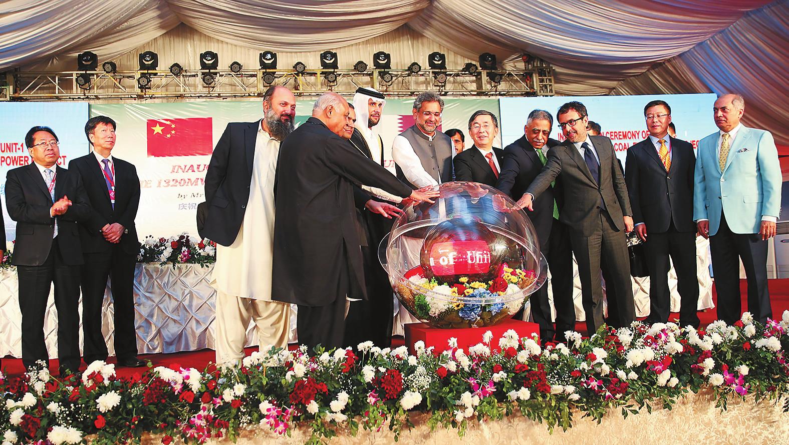 巴基斯坦總理阿巴西(右六)、中國電建董事長晏志勇(右五)、卡塔爾AMC公司董事長賈西姆(右七),以及與會(huì)嘉賓共同觸摸啟動(dòng)機(jī)組的水晶球。 康從欽 攝  900個(gè)日夜逐夢前行,7000余名中巴建設(shè)者同力協(xié)契,造