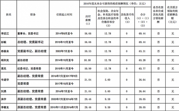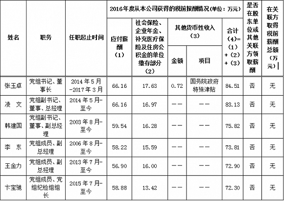 除董事長、總經(jīng)理外,神華集團三位副總經(jīng)理韓建國、李東和王金力的薪酬分別是75.82萬元、73.81萬元和72.9萬元。黨組成員、黨組紀檢組長卞寶池為72.3萬元。2016年,神華集團六位領導的薪酬合計約為462萬元,平均每人77萬元。