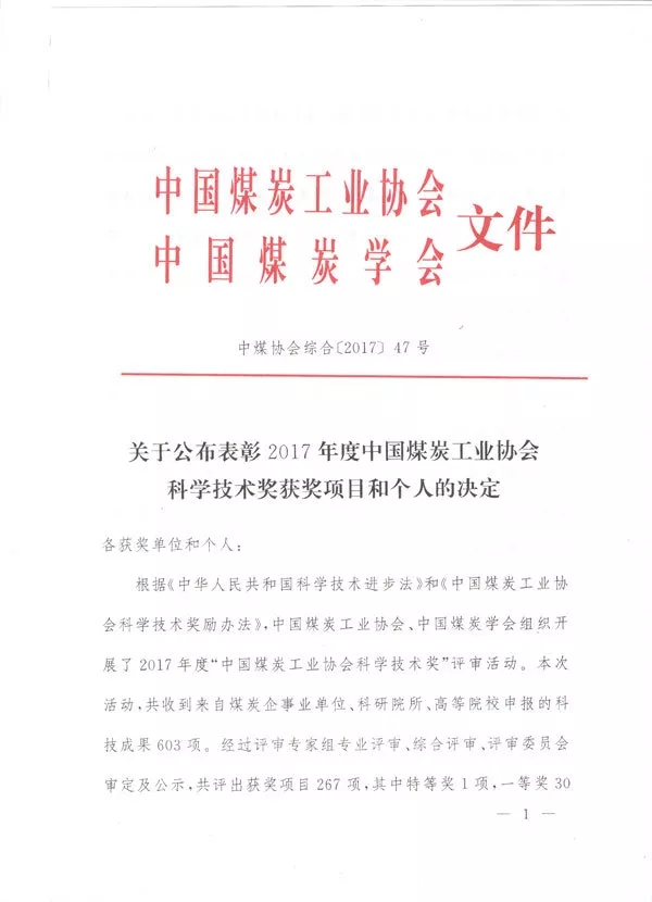 中國(guó)煤炭工業(yè)協(xié)會(huì)科學(xué)技術(shù)獎(jiǎng)是中國(guó)煤炭行業(yè)最高綜合性科學(xué)技術(shù)獎(jiǎng),是煤炭行業(yè)的“奧斯卡”!獎(jiǎng)項(xiàng)由中國(guó)煤炭工業(yè)協(xié)會(huì)和中國(guó)煤炭學(xué)會(huì)共同設(shè)立,從2002年至今已舉行16屆。旨對(duì)在煤炭工業(yè)科學(xué)研究、成果轉(zhuǎn)化、技術(shù)推廣中做出突出貢獻(xiàn)的科技人員和單位進(jìn)行獎(jiǎng)勵(lì),推動(dòng)煤炭行業(yè)科技進(jìn)步,具有廣泛影響力。