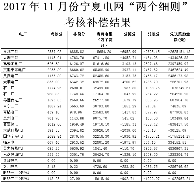 2017年11月份寧夏電網(wǎng)“兩個(gè)細(xì)則”考核補(bǔ)償情況