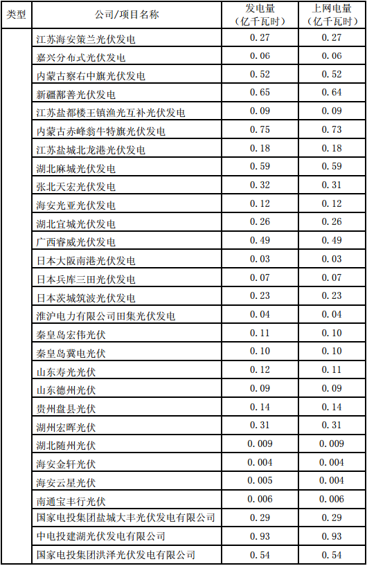 (1)新增新能源控股裝機(jī)容量44.62萬(wàn)千瓦:湖北隨州光伏投產(chǎn)新增1.08萬(wàn)千瓦,湖北孝感光伏投產(chǎn)新增4萬(wàn)千瓦,山東鄆城光伏投產(chǎn)新增3萬(wàn)千瓦,漕涇移動(dòng)式光伏投產(chǎn)新增2萬(wàn)千瓦,湖南華容一期光伏投產(chǎn)新增4萬(wàn)千瓦,湖南華容二期光伏投產(chǎn)新增4萬(wàn)千瓦,廣西武鳴光伏投產(chǎn)新增5萬(wàn)千瓦,河南萬(wàn)邦光伏投產(chǎn)新增6萬(wàn)千瓦,湖北荊門(mén)光伏投產(chǎn)新增3.38萬(wàn)千瓦,湖北當(dāng)陽(yáng)光伏投產(chǎn)新增4萬(wàn)千瓦,山東海陽(yáng)光伏投產(chǎn)新增1.9萬(wàn)千瓦,海安濱海產(chǎn)業(yè)園光伏投產(chǎn)新增1.085萬(wàn)千瓦,海安金軒光伏投產(chǎn)新增0.661萬(wàn)千瓦,海安云星光伏投產(chǎn)新增0.678萬(wàn)千瓦,宿遷泗洪光伏投產(chǎn)新增2.04萬(wàn)千瓦,湖南漣源光伏投產(chǎn)新增1.8萬(wàn)千瓦。