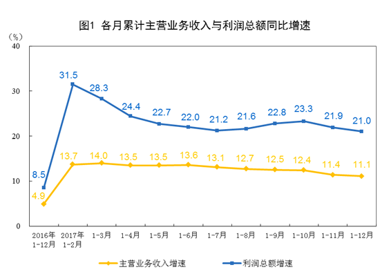 2017年12月份,規(guī)模以上工業(yè)企業(yè)實現(xiàn)利潤總額8241.6億元,同比增長10.8%,增速比11月份放緩4.1個百分點。