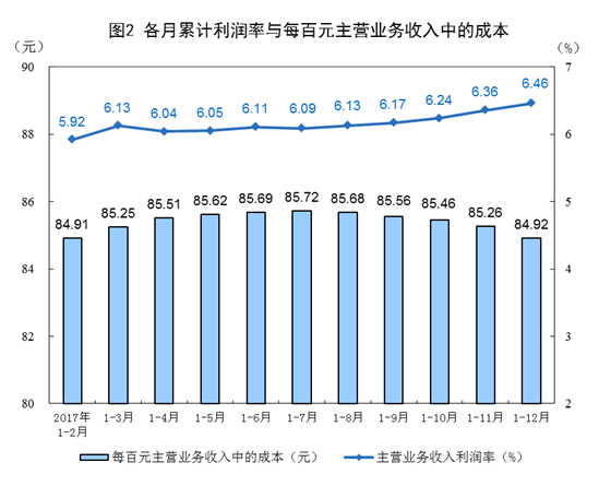 2017年,規(guī)模以上工業(yè)企業(yè)實現(xiàn)主營業(yè)務(wù)收入116.5萬億元,比上年增長11.1%;發(fā)生主營業(yè)務(wù)成本98.9萬億元,增長10.8%;主營業(yè)務(wù)收入利潤率為6.46%,比上年提高0.54個百分點。