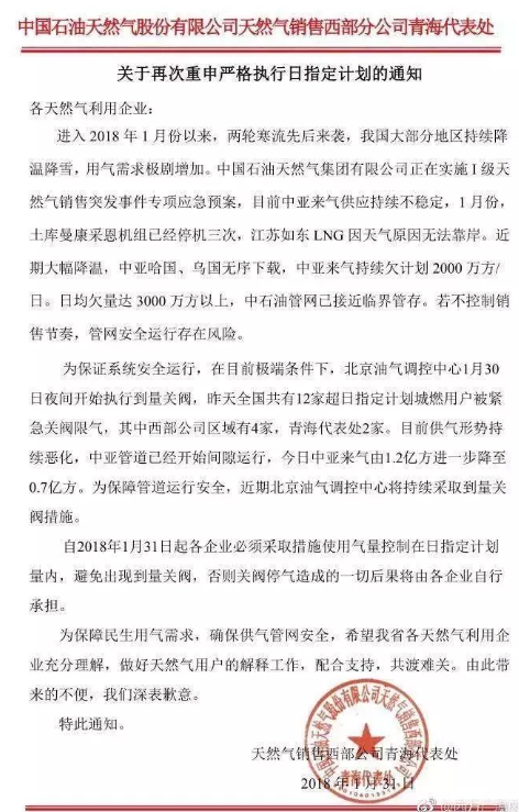 京津冀氣荒未完全解除之際,西北地區(qū)的氣荒又不期而至,至于何時能完全解決氣荒,官方并未明確說明,文件均提出最大限度保證民生用氣,希望大家都可以度過一個溫暖的冬天。