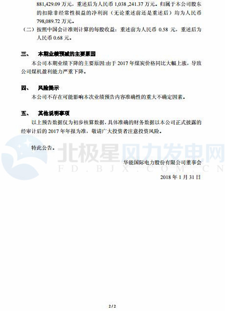 華能?chē)?guó)際預(yù)計(jì)2017 年歸屬于股東的凈利潤(rùn)與上年同期(重述前)相比,減少650,000 萬(wàn)元到 740,000 萬(wàn)元,同比減少 74% 到 84%;與上年同期(重述后)相比減少人民幣 810,000 萬(wàn)元到 900,000 萬(wàn)元,同比減少 78% 到 86%。