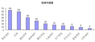 在微博傳播(新浪微博V用戶)方面,致遠(yuǎn)軟件的微博傳播量達(dá)64條,位居第一;其次是泛微,其微博傳播量為59;通達(dá)信科的微博傳播量為40,排在第三位。