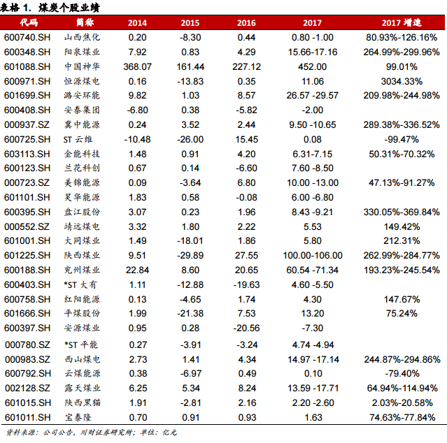 1.1 多家上市煤企發(fā)布2017年業(yè)績(jī)預(yù)告,普遍盈利