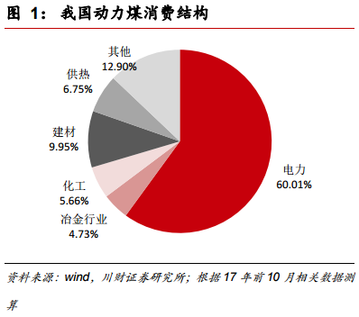 動(dòng)力煤下游中,火力發(fā)電占了60%,其次是建材、供熱、化工、冶金,各自占了9.95%、6.75%、5.66%、4.73%。
