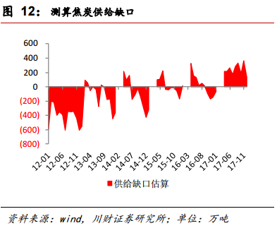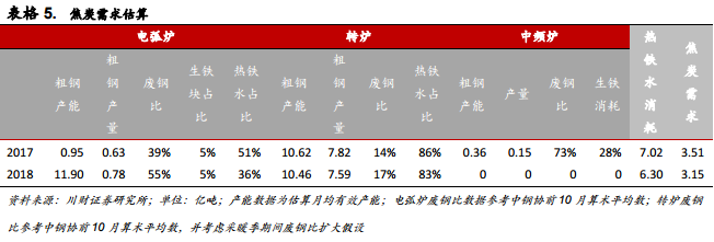 估算2018年煉鋼焦煤、焦炭需求為4.73、3.15億噸。煉鋼中廢鋼使用擴(kuò)大將減少焦炭需求,目前,粗鋼/生鐵比仍有擴(kuò)大空間,特別是2018年電弧爐復(fù)產(chǎn)、投產(chǎn)增多,將進(jìn)一步推升廢鋼消耗量。2017年粗鋼/生鐵比達(dá)到1.17,假設(shè)2018年全年粗鋼/生鐵比達(dá)到1.27、2018年粗鋼產(chǎn)量小幅增長(zhǎng),則焦炭需求將下降10%,相應(yīng)的焦煤、焦炭需求量分別為4.73、3.15億噸。