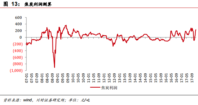 需求旺盛,供給偏弱,2017年焦炭供應(yīng)趨緊。2017年4月,發(fā)改委解除276個(gè)工作日制度、恢復(fù)330個(gè)工作日制度,2017年實(shí)現(xiàn)原煤產(chǎn)量34.45億噸,同比增加3.20%,2017年實(shí)現(xiàn)焦煤產(chǎn)量4.45億噸,同比增加2.25%。2017年實(shí)現(xiàn)焦炭產(chǎn)量4.31億噸,同比下降3.3%。在焦煤-焦炭-鋼鐵環(huán)節(jié)中,2017年的焦炭產(chǎn)能收縮較多,表現(xiàn)相對(duì)強(qiáng)勢(shì)、利潤(rùn)恢復(fù)較多。