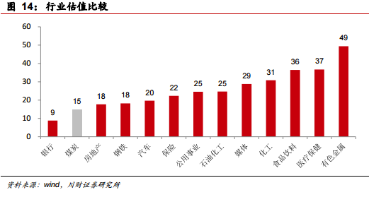 煤炭行業(yè)動(dòng)態(tài)PE相較其他行業(yè)偏低。目前煤炭板塊PE(TTM)為14.84倍,同屬周期行業(yè)的有色金屬板塊PE(TTM)為49.39倍,鋼鐵板塊PE(TTM)為18.24倍,石油化工板塊PE(TTM)為24.71倍,煤炭在周期行業(yè)中有一定估值優(yōu)勢(shì)。與消費(fèi)類行業(yè)相比,食品飲料板塊PE(TTM)為46.48倍,醫(yī)藥保健板塊PE(TTM)為36.69倍,煤炭板塊估值優(yōu)勢(shì)更加明顯。