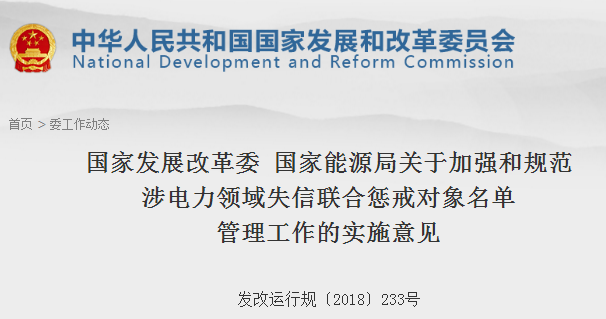國家發(fā)改委、能源局印發(fā)關(guān)于加強(qiáng)和規(guī)范涉電力領(lǐng)域失信聯(lián)合懲戒對象名單管理工作的實施意見