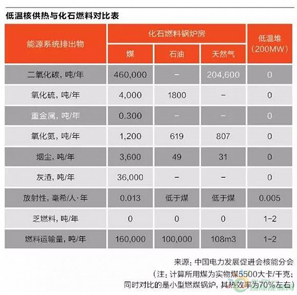 “核能供熱的突出優(yōu)勢(shì)表現(xiàn)在低溫供熱上。因?yàn)楹朔磻?yīng)堆原理與鍋爐燃燒原理完全不同,燃料燃燒必須保持爐膛的高溫,供應(yīng)低溫?zé)嵋膊荒芙档?。而核裂變反?yīng)可以發(fā)生在任何溫度下,如果僅僅要求供應(yīng)低溫?zé)幔磻?yīng)堆就可以工作在低溫低壓條件下,都可以簡(jiǎn)化反應(yīng)堆結(jié)構(gòu),提高安全性和降低造價(jià)。這就是前些年許多國(guó)家紛紛投入力量,開(kāi)展低溫核供熱研究的原因。”清華大學(xué)核能技術(shù)設(shè)計(jì)研究院教授田嘉夫分析。