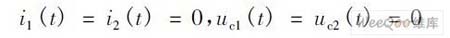 該方程組含有4 個(gè)未知數(shù):i1( t),i2( t),uc1(t),uc2( t),其定解條件直接由電路的初始儲(chǔ)能情況給出。當(dāng)無(wú)初始儲(chǔ)能時(shí),為齊次初始條件,即: