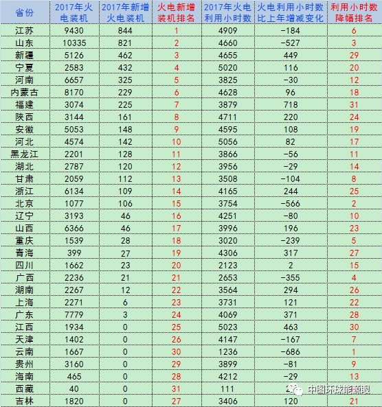 表12017年分省火電裝機(jī)及火電利用小時(shí)數(shù)與上年情況對比